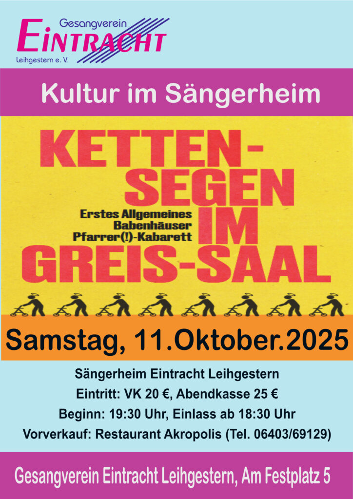 Im Rahmen der Reihe „Kultur im Sängerheim“ ist am Samstag, 11.10.2025 das Erste Allgemeine Babenhäuser Pfarrer-Kabarett zu Gast im Sängerheim.